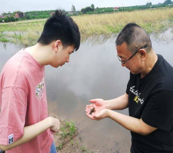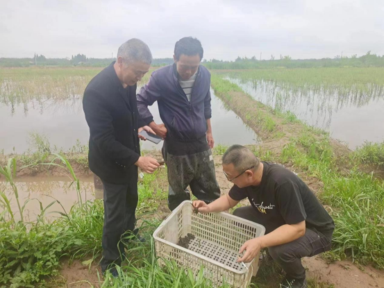 (高级水产工程师李庚和乡村振兴队员高级兽医师罗友谊在大雨间隙给虾农作技术指导)