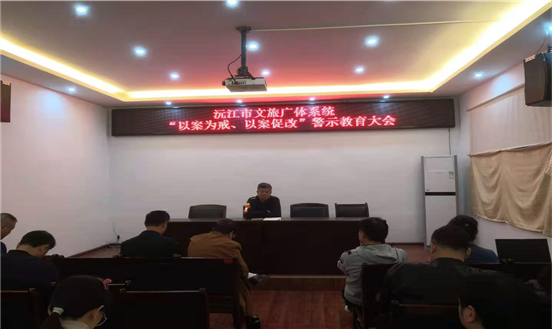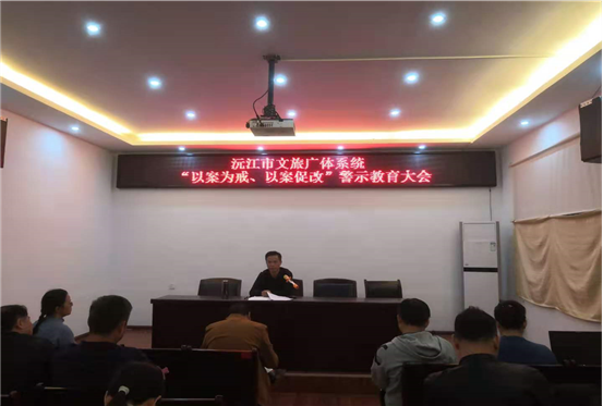 为进一步突出用身边事教育身边人,推进党风廉政建设,11月11日晚,市文旅广体局召开“以案为戒、以案促改”警示教育大会,市纪委驻宣传部纪检监察组组长陶志敏出席会议,会议由副局长蔡进主持,局机关全体工作人员及局属单位全体班子成员参加会议。