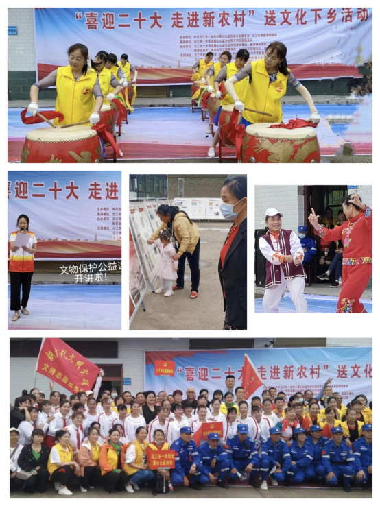 9月22日下午,沅江市洞庭湖博物馆携手一米阳光爱心公益协会,集结11支公益队伍百余人力量,联合开展了“喜迎二十大,走进新农村”送文化下乡活动。以群众喜闻乐见的载歌载舞共庆形式,为共华镇仁安村的父老乡亲送上了一场“红歌新唱”的传统文化盛宴。看那集体鼓舞气势磅礴、花鼓戏选段幽默诙谐、诗歌《永远跟党走》的朗诵热血澎湃、“抗疫情景剧”表达必胜信心、“我和我的祖国”歌唱爱国情怀……精彩纷呈的文艺表演强化了新时代文明实践,拓展了文博志愿服务内容,更助推了乡村文化振兴,而且为农民朋友带来了了一次精神上的饕餮盛宴。