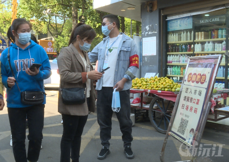 在湘北市场的各通道出入口,工作人员正在对每一名进入市场的群众进行扫场所码、戴口罩,提醒他们在市场购物时保持间距,勤洗手、多通风,做好日常个人防护工作。