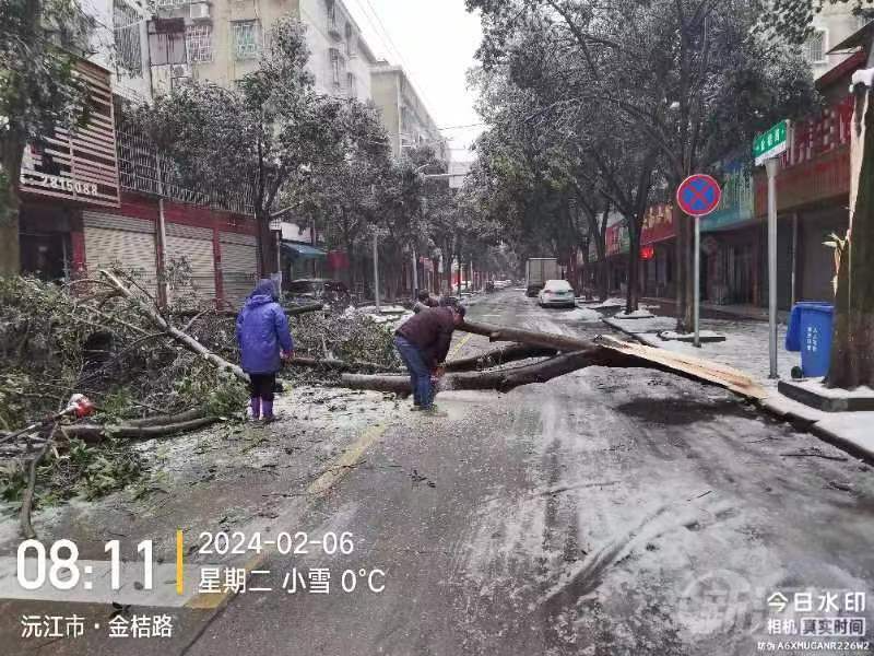 2月5日,低温雨雪冰冻天气持续,城区道路大部分行道树被压弯、断枝、倒伏,灾情严重。为避免倒伏、断枝树木对道路交通以及市民日常生活造成影响,沅江市市城管综合执法局园林绿化服务中心第一时间紧急抢救倒伏、断枝树木,排危除障保道路畅通。
