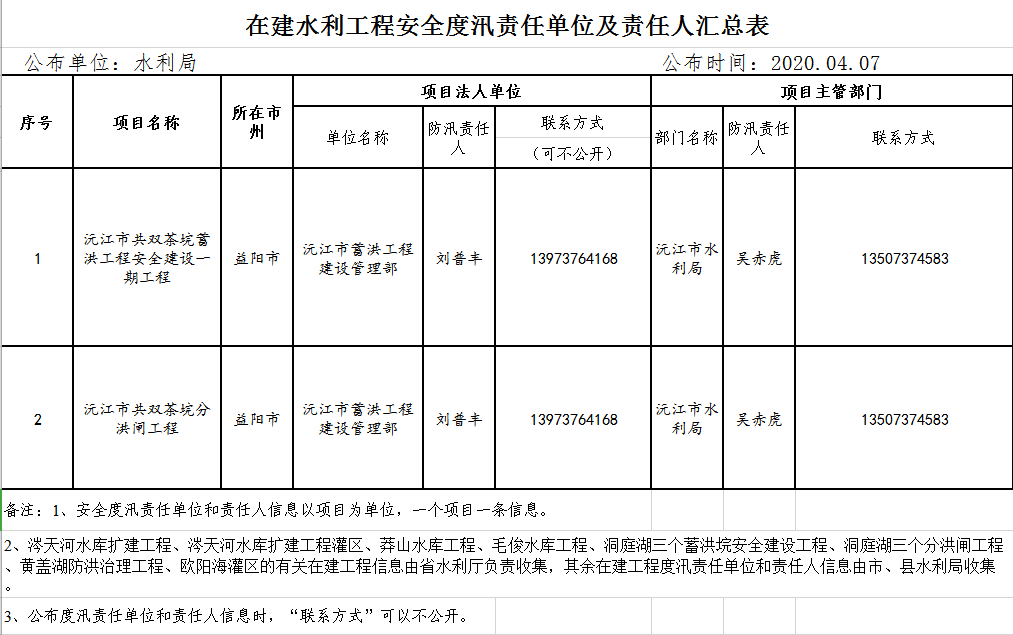 在建水利工程安全度汛责任单位及责任人汇总表