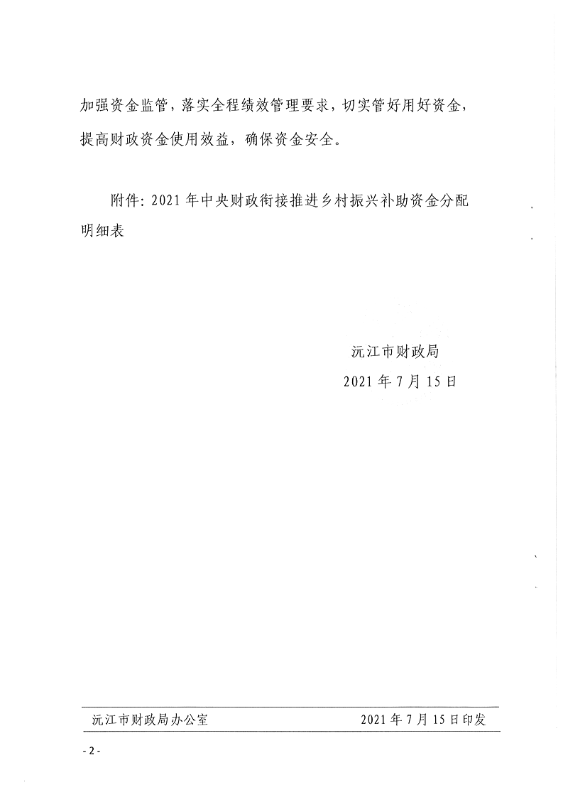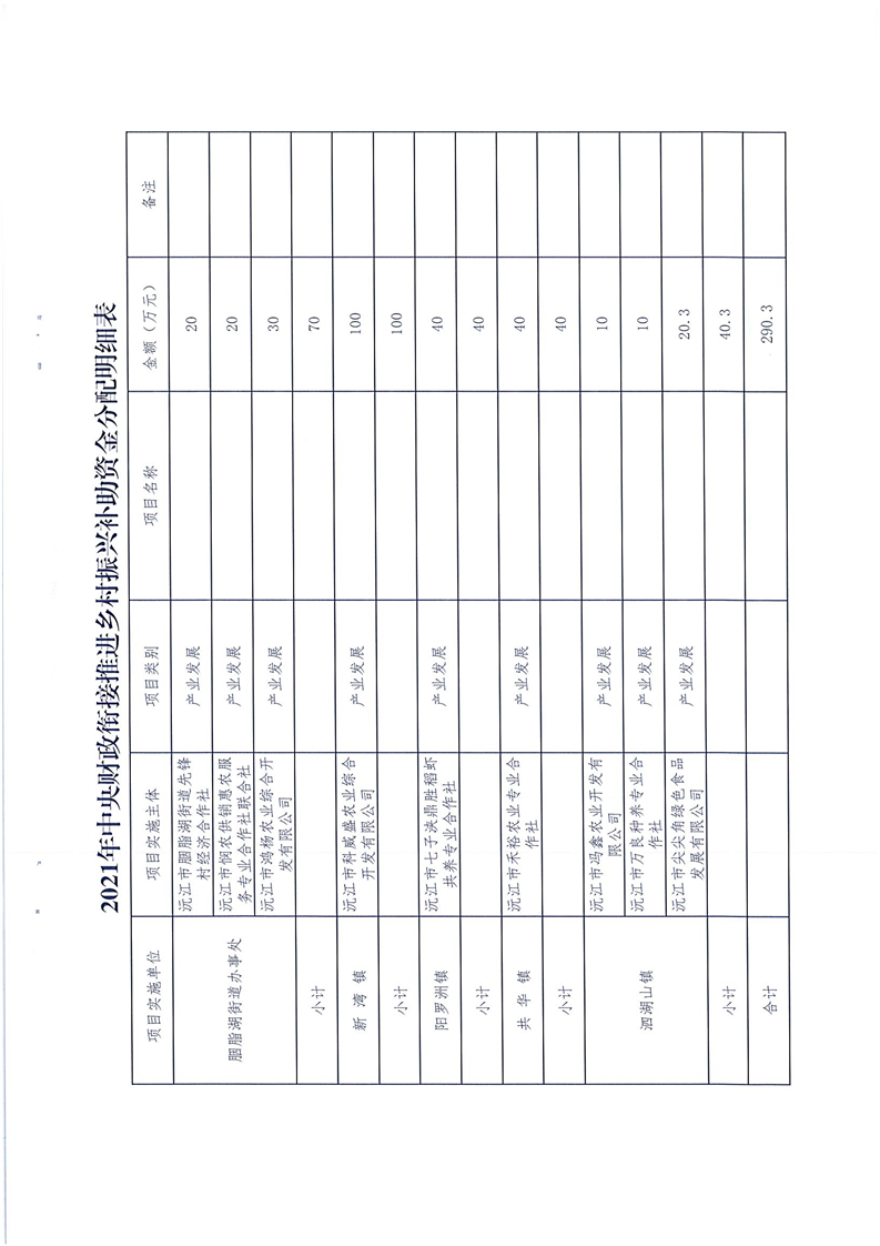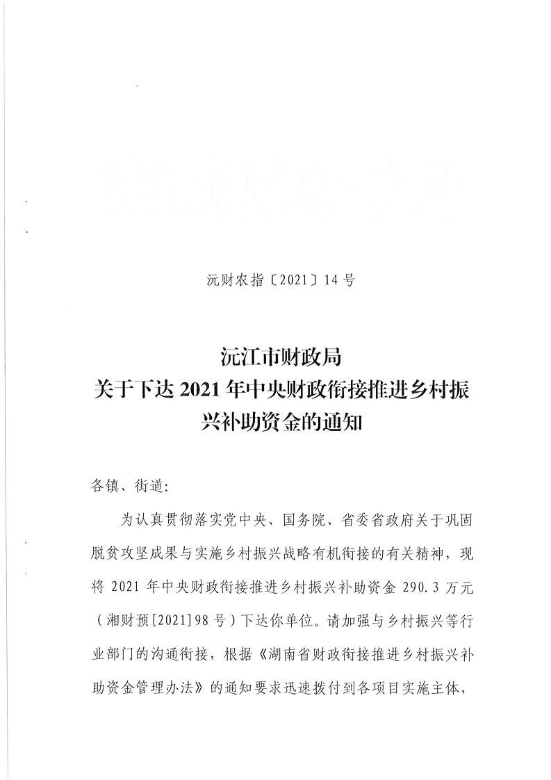 沅财农指【2021】14号 沅江市财政局关于下达2021年中央财政衔接推进乡村振兴补助资金的通知