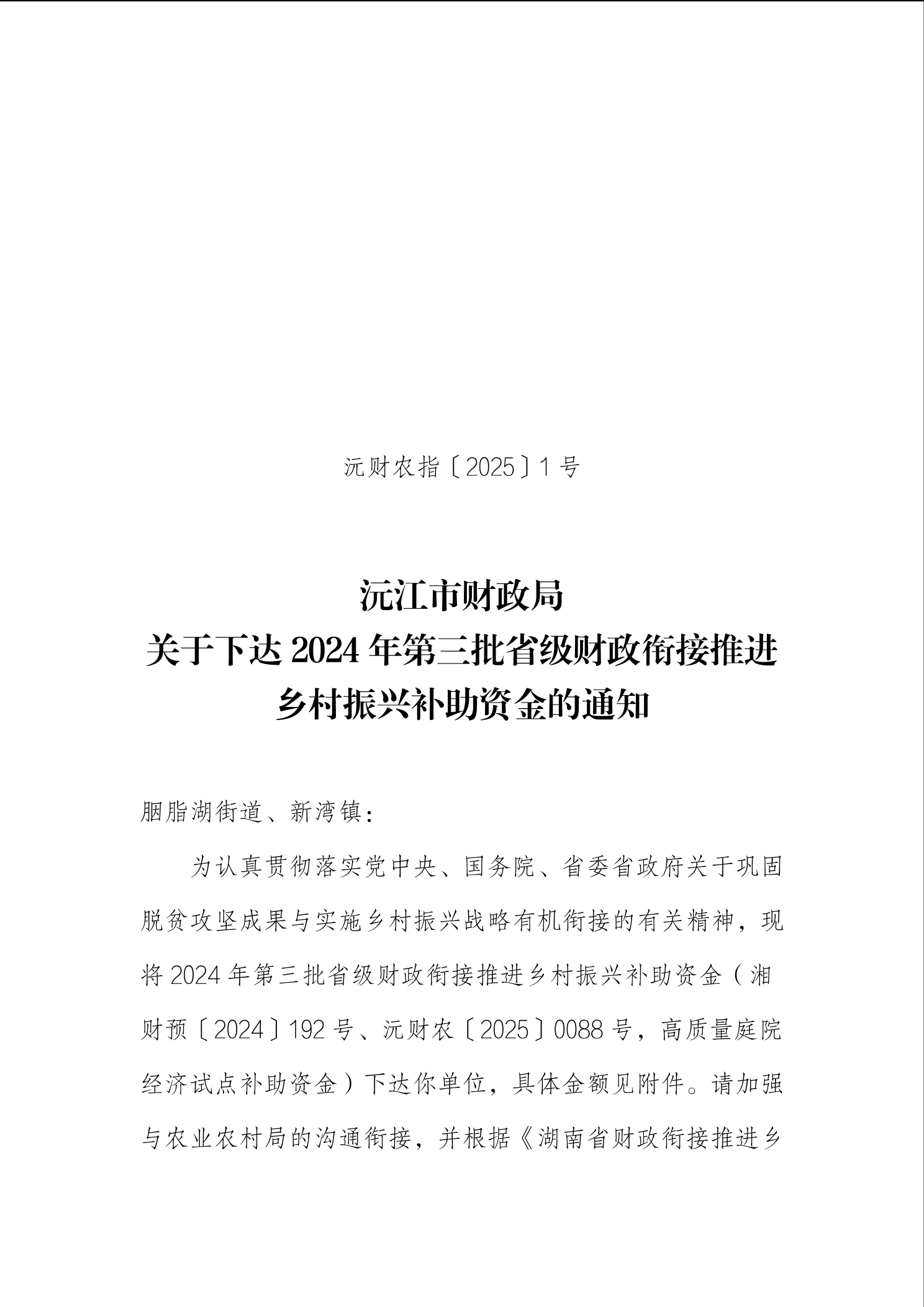 沅财农指 [2025] 1号 沅江市财政局关于下达2024年第三批省级财政衔接推进乡村振兴补助资金的通知