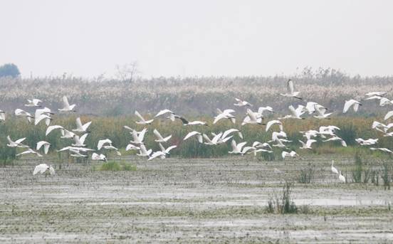 初冬时节,在南洞庭自然保护区明朗山洲岛,远远望去,只见成群结队的白鹤、白琵鹭、赤颈鸭、苍鹭、小天鹅时而在水面觅食、嬉戏玩耍,时而盘旋飞翔,构成了一幅生机勃勃的生态画卷。