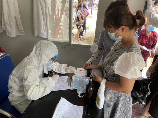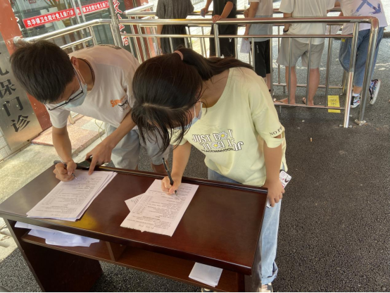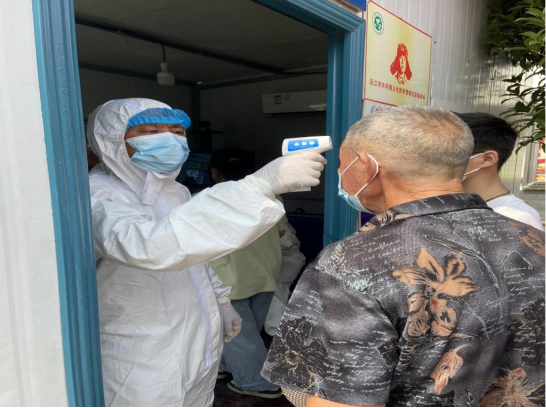 在预检分诊处,医护人员不惧酷暑,头顶烈日,身着全套防护服,为前来接种疫苗的群众进行体温测量、信息登记和“三码联查”(健康码、行程卡及疫苗接种)。