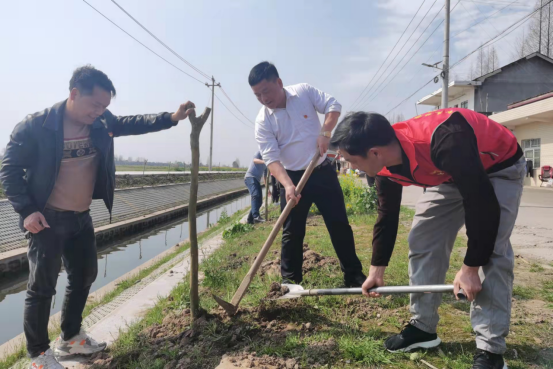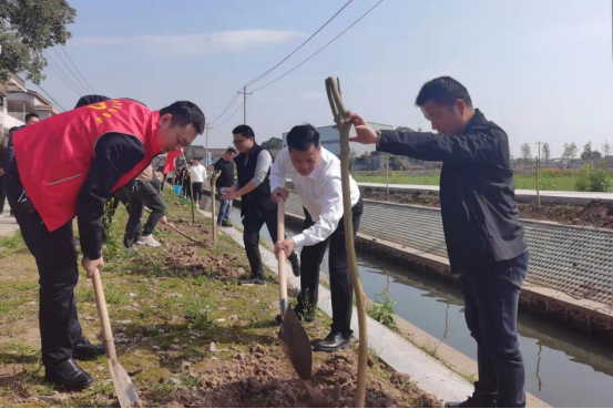 为确保植树工作顺利开展,镇农业综合服务中心和上码头村“两委”工作人员提前定点,制定好种植标准和工作流程,现场指导示范,确保植树成活率。植树现场,大家高举党旗,佩戴党徽,穿上红色志愿马甲,书记镇长带头种植,党员们干劲十足。大家三五人一组,分工协作,或挥锹铲土,或扶直苗木,或踏土夯实,或浇水灌溉,配合默契,共同在沟渠沿线种下紫薇等树苗近百株。在暖暖的阳光下,党员的红与春天的绿交相辉映,共谱一曲春日新农村的赞歌。