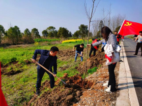 在植树现场,一片挥锹植绿热火朝天的景象,参加植树的党员、群众,分片分区栽植。挖坑翻土、扶苗覆土、浇水夯土,大家每道工序都一丝不苟,确保种一株,活一株,共计种植银杏树300棵。