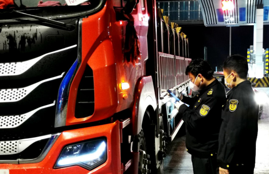 4月5日晚,两名党员交通执法人员在沅江北高速出口查验外地入沅车辆驾驶人员的梭酸检测情况。