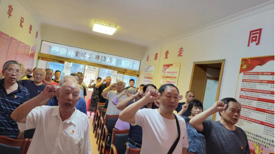 在支部副书记吴绍坤的带领下,老党员们重温了入党誓词,回顾了入党宣誓时的庄严承诺和坚定决心,再次接受了一次心灵上的洗礼和深刻的党性教育。他们高亢有力的宣誓声抒发了对党的深厚感情,表达了老干部们继承党的优良传统,牢记党的宗旨,永远听党话、感党恩、跟党走的坚定意志。