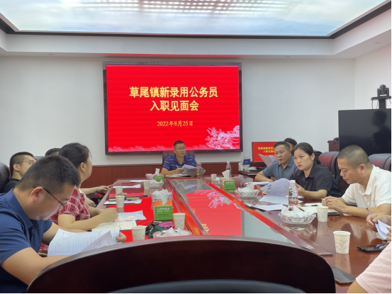 8月25日,草尾镇召开2022年度新录用公务员入职见面会。全体在家班子成员参加。