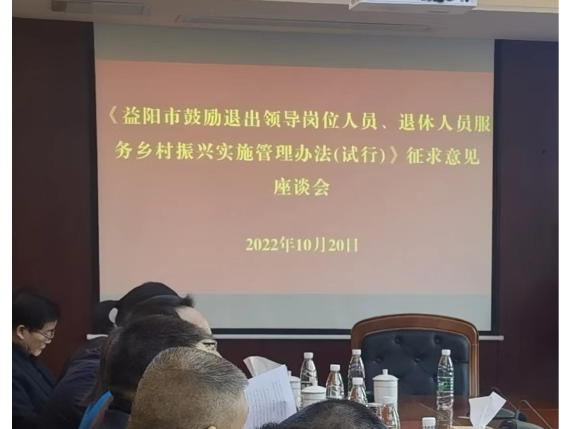 10月20日,益阳市委基层办主任方平一行来沅召开《益阳市鼓励退出领导岗位人员、退休人员服务乡村振兴实施管理办法(试行)》征求意见座谈会,沅江市委组织部副部长、两新工委书记郭瓒及相关职能部门分管领导,乡镇党委书记、退线领导代表参加座谈会。