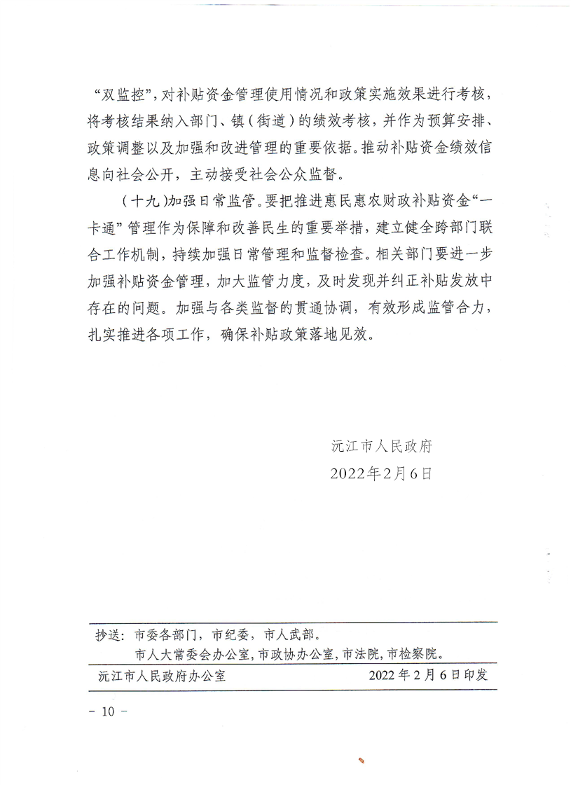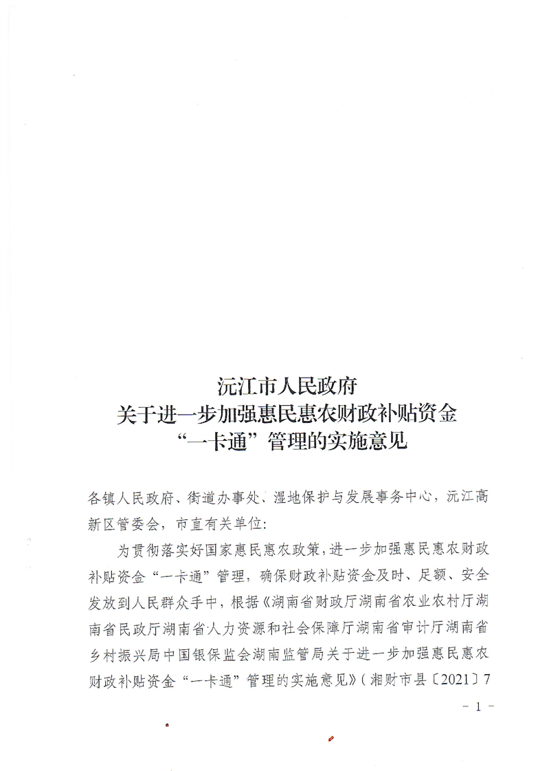 沅江市人民政府关于进一步加强惠民惠农财政补贴资金“一卡通”管理的实施意见