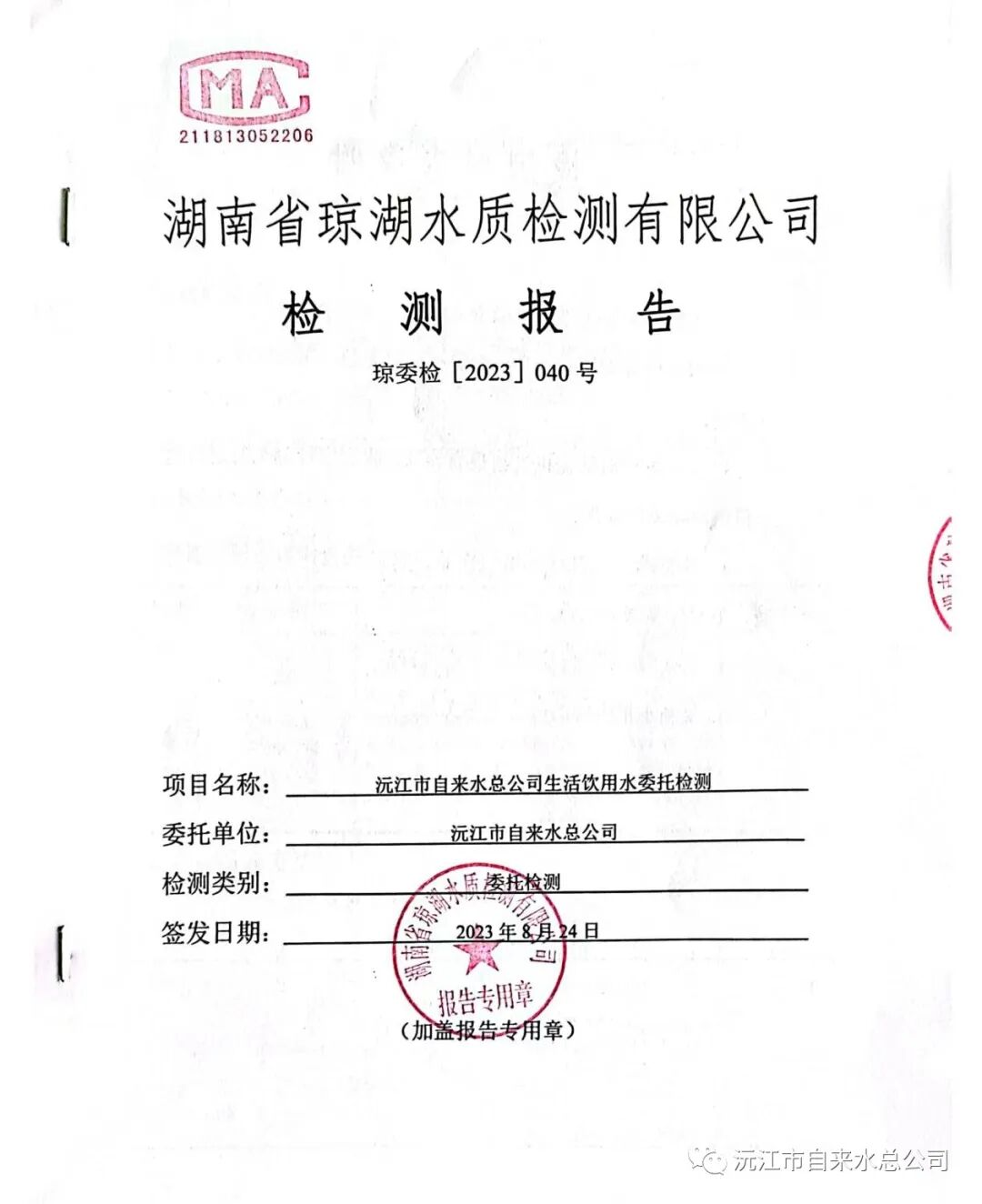 以下为您公示的是2023年8月份沅江市自来水总公司管网水送检水样的月检报告,检验结果均符合《生活饮用水卫生标准》(GB/T5749-2022),水质合格率100%。