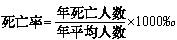 死亡率(又称粗死亡率) 指在一定时期内(通常为一年)一定地区的死亡人数与同期内平均人数(或期中人数)之比,用千分率表示。本资料中的死亡率指年死亡率,其计算公式为: