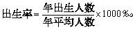 出生率(又称粗出生率) 指在一定时期内(通常为一年)一定地区的出生人数与同期内平均人数(或期中人数)之比,用千分率表示。本资料中的出生率指年出生率,其计算公式为: