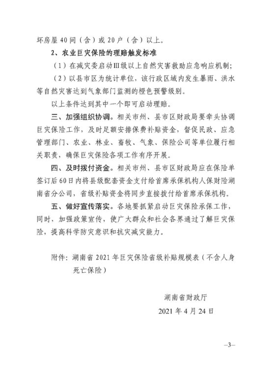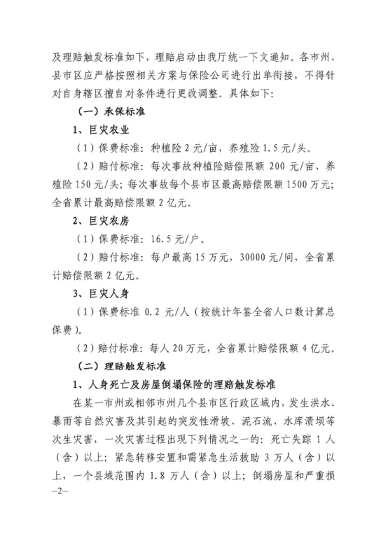保障范围:巨灾保险的保障范围涵盖我省经常遭受的暴雨、洪水自然灾害及其引起的突发性滑坡、泥石流、水库溃坝等次生灾害造成的大宗农产品绝收或死亡。