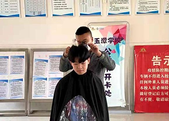 4月25日,沅江市玉潭学校高中部邀请发型师上门,为寄宿制学生理发,避免学生进出公共场所理发增加感染风险。