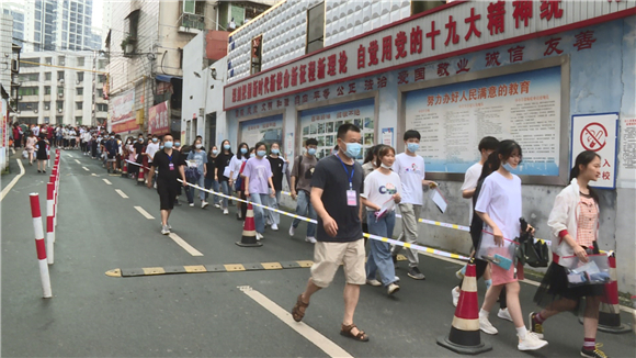 7月7日,在沅江市琼湖中学考点外,不少考生在家长的陪同下陆续来到考点。在考点入口处,学校设立好了考生专用通道以及体温检测点,所有进入考点的人员都将进行体温测量,体温低于37.3℃方可进入考点。不少家长跟考生已经在考点外等候,考生们有的在看书做最后的复习,有的聚集在一起为彼此加油打气。