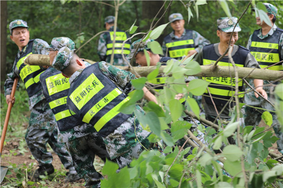 7月14日,沅江市调集民兵突击队200百多人,对保民垸大堤内侧一处长达300米的灌木林进行清基扫障,方便巡逻人员进一步开展巡逻查险。