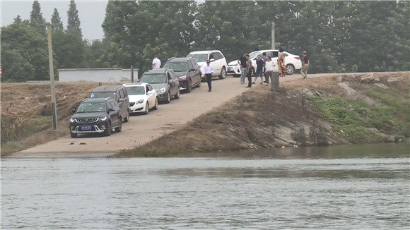 7月18日,在南洞庭芦苇场外的河面上,一艘载着车辆的轮渡正劈波斩浪向岸边驶来,这边大堤上待渡的车辆已排成了一条长龙。村民范少珍说:“住在南洞庭芦苇场很不方便,平日里买点菜和日用品都要坐轮渡。”