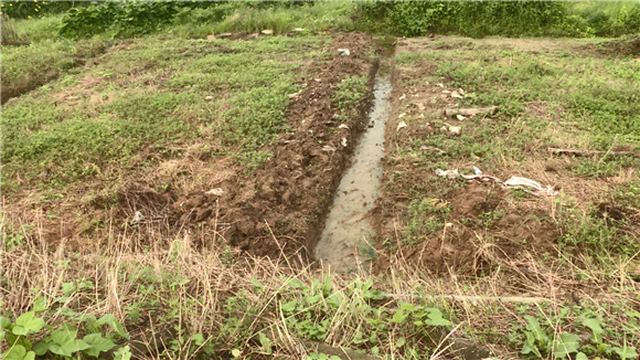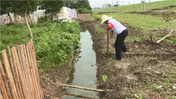 来到长春垸万子湖村中队负责堤段,两名巡逻员正在对大堤进行巡查。他们仔仔细细地排查着这处不知道来回走了多少趟的大堤,每一条浸沟,每一寸堤面都不放过。昨天刚下过暴雨,有些浸沟旁的泥土被冲塌,他们就一铲一铲地修补好浸沟,确保大堤安全。