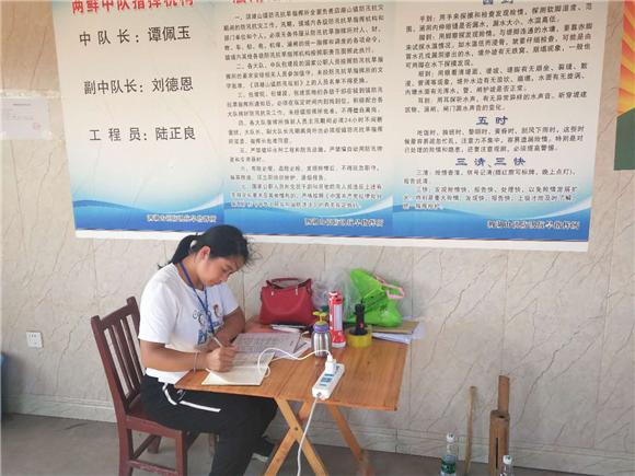 7月14日,两鲜中队的中队部附近突发险情,险情处理完后,尽管有专人值守,王脱险仍不放心,经常到出险处查看,时刻关注动态,以防险情再次发生后出现处理不及时的情况。防汛抗灾现在是泗湖山的头等大事,村里仍有一些工作必须兼顾,王脱险便利用空余时间,能用手机完成的就在手机上完成,必须电脑操作的就等晚上下班再骑着摩托到村部去做。每天回到家已是满身疲惫,但王脱险从未抱怨过,甚至把村里安排她值白班不值晚班当成对她的“照顾”。工作时间长了,自然无暇顾及到家庭,王脱险的儿子现在正放暑假,也被她“丢”到了外婆家照顾,当问到家人是否对她有抱怨的时候,王脱险自豪地说:“那不会嘞,我家人也要防汛,我老公、我姐夫还有我爸爸他们今年也全都参与了防汛,只要村里需要,一个电话就可以喊他们上阵。”村里的干部陆正良提起她也是连连夸赞:“王脱险是个责任心非常强的同志,也特别能吃苦,从没把自己当成需要照顾的女同志看待,这次防汛工作做得相当不错。”