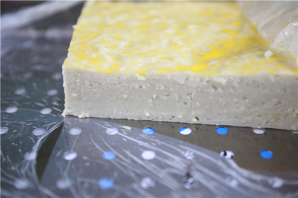 鱼糕的制作过程比较繁琐,记者今天就见证了鱼糕制作的全过程。先将新鲜草鱼宰杀,解除鱼头、鱼骨、鱼皮,剔掉红肉,解刀后入水浸泡。新鲜猪板油解刀后一同泡水,两种食材按比例配好,加上生姜,再用绞肉机绞碎。加入鸡蛋清和淀粉,加上适量的盐,充分搅拌均匀后放入蒸盒,用刀抹平后放入笼蒸,蒸20分钟后,将鱼糕取出,在鱼糕上面涂抹一层鸡蛋黄,再放进蒸笼蒸熟, 一道鲜美的鱼糕便制成了。