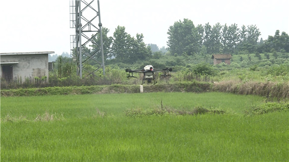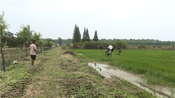 7月21日,在沅江市南洞庭芦苇场东头咀管区的田间地头,一架无人机正在一大片田野上空翩翩飞舞,药液随着喷嘴的高速旋转,均匀地喷洒在禾苗上。