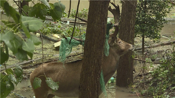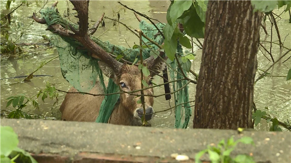 7月12日上午,家住漉湖船码头居民张海华,在自家附近,看见一头体力透支的麋鹿被卡在菜园的矮围墙上,无法动弹。村民张海华回忆道:“当时不知道它怎么来的,后脚在河边,前脚在岸上,肚皮隔在围栏上,动也不好动,当时它还发出叫声,我就加紧叫来防汛队员一起抬着它的脚往围墙外用力,很快就出去了。”