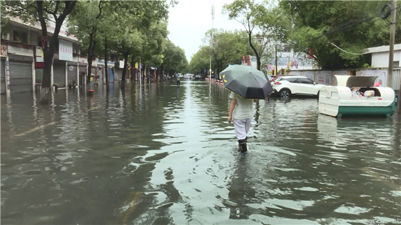 7月27日上午,在凌云塔社区记者看到,出行的市民纷纷挽起裤腿、穿着雨靴在路面艰难行走。此路段受持续强降雨影响,不少居住在一层的市民家中多处进水,积水严重,地势低洼处积水达半米,而道路两侧的商铺也进水严重,商家纷纷将剩余的货物搬至车上,或拿砖头将货物支架起。