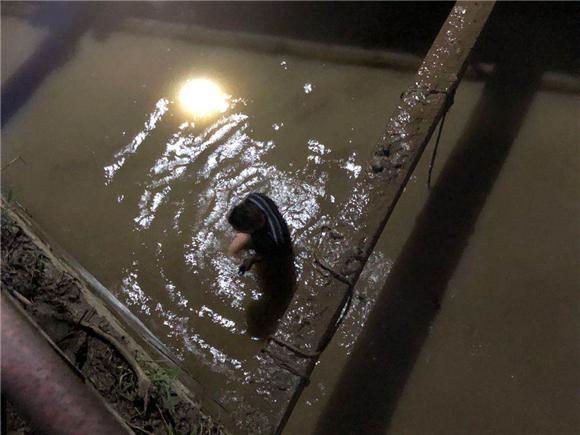 7月9日晚8点,胜天电排出现疑似管涌的紧急情况,杨梦辉迅速赶到现场,需要下水时,他二话不说就跳到闸口水里,弯着腰弓着身子一步一步仔细摸排,最后发现闸门止水橡皮损坏,经技术组集体研究讨论,决定采取抬高水位,减小水头差的方法,最终成功处理险情。