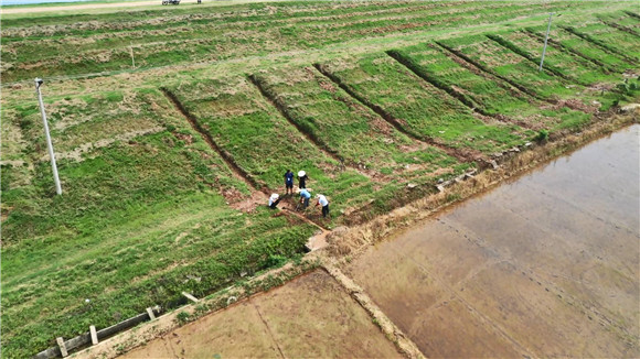 经过再次高标准清基扫障以后,六大队值守堤段,堤面整洁,堤身及堤脚看不见一根杂草,巡逻查险一览无余。顶着炎炎烈日,防汛队员头戴草帽正在对大堤堤脚开沟,清除积水,以保持堤脚的干燥。相对堤面来说,堤脚更加的闷热潮湿,防汛队员都是汗如雨下,身上的衣服全都汗湿了,但他们擦了擦脸上的汗,又继续投入到开沟工作中。同时,巡逻人员也在党员的带领下,对大堤进行着仔细排查,面对当前的防汛形势,六大队充分发挥党员带头作用,做好防汛各项工作,确保大堤安全。