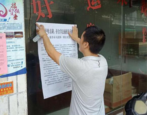 执法人员在张贴公开信