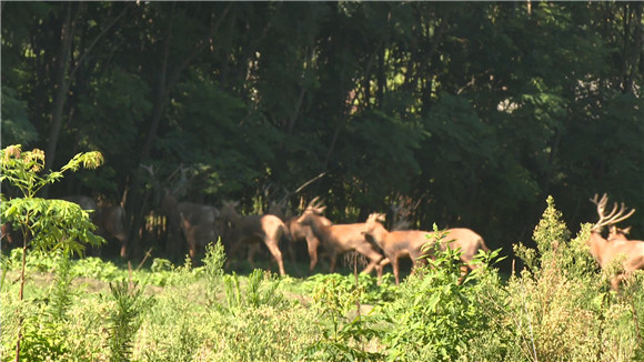 在漉湖芦苇场兴隆管区,清晨的阳光照耀着一片茂密的丛林。几只生性敏感的麋鹿站在小树的荫影下,听到天空无人机的响声,迅速抬头看一下,然后结伴跑向远方。往年上岸的麋鹿显得零零散散,不像今年,一下子上来几十只。有的居民说是32只,有的说是34只,还有的说是37只,不一而足,但种群数量肯定比往年要多。居民周德利说,“它们一来就是几十只,那天我们在这里数了34只,他们说那边还有一群,不知道是不是这群跑过去的”。