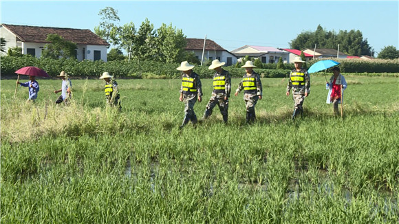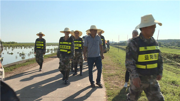 8月5日,中午时分,在该镇曾经的出险点,50名民兵突击队员正与当地防汛群众顶着烈日一同进行百人百米巡查。这是今天的第二次集中排查,只见民兵与群众排成一线,相隔不到一米,对大堤百米处进行地毯式“搜索”,大家边走边仔细地查看情况,不少队员为了能够更清楚地去感受,纷纷脱下鞋子,不留死角地进行排查。在玉竹中队,像这种集中性的百人百米排查每天会有三轮,按照防汛工作要求,每次排查人员不能少于100人,通过这种集中式排查,确保险工险段以及大堤百米浸角内不出现任何险情。