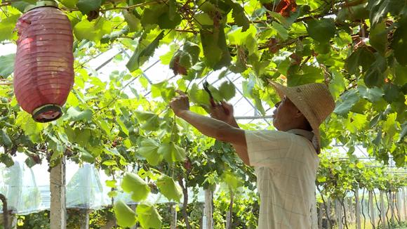 来到一个农庄,很远就闻到芳香四溢,一株株修剪整齐的葡萄树枝繁叶茂,绿叶下挂满了一串串玛瑙般的葡萄,淡淡的果香令人垂涎欲滴。十几名工人正忙着给葡萄树剪枝,让果实更加充分地吸收营养,从而进一步提升坐果率。