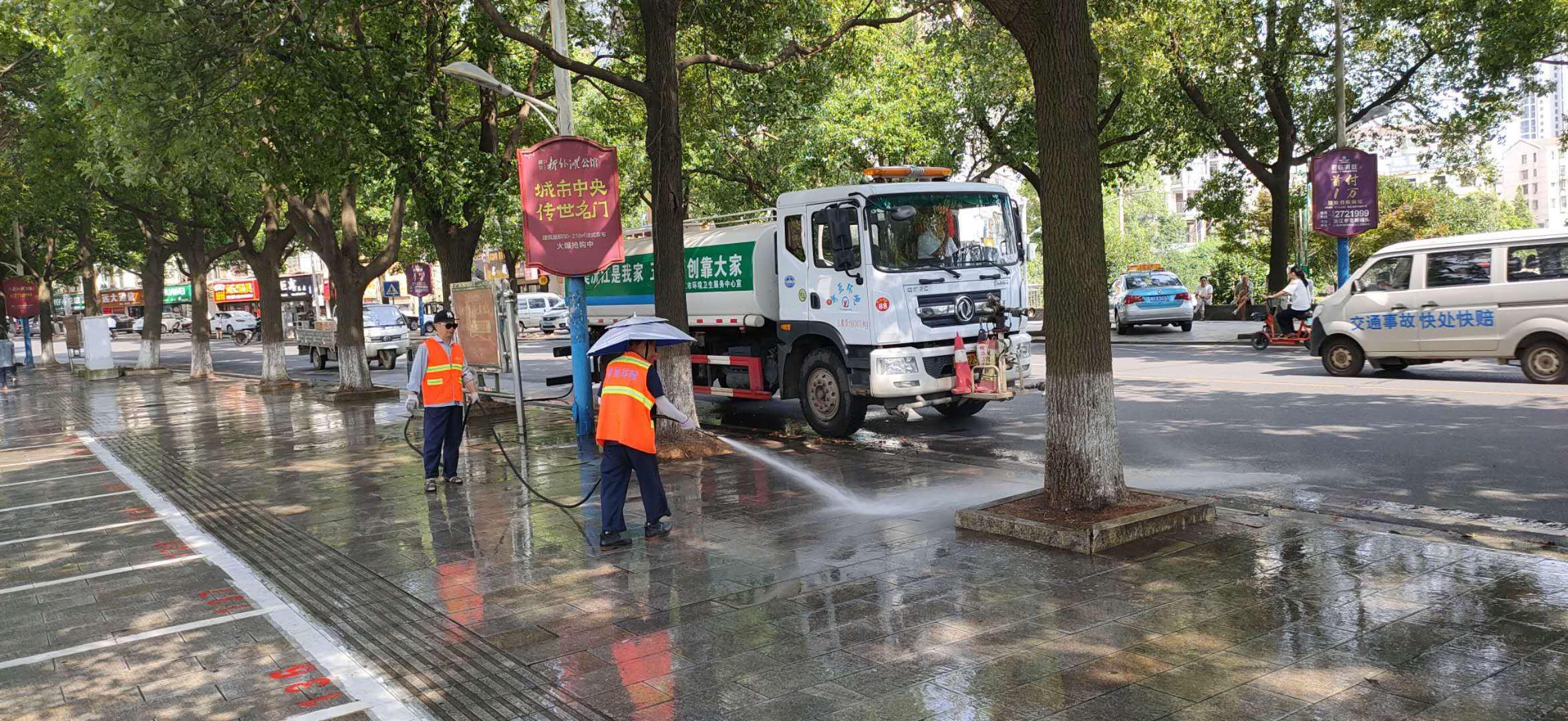 环卫工人冲洗湖心路