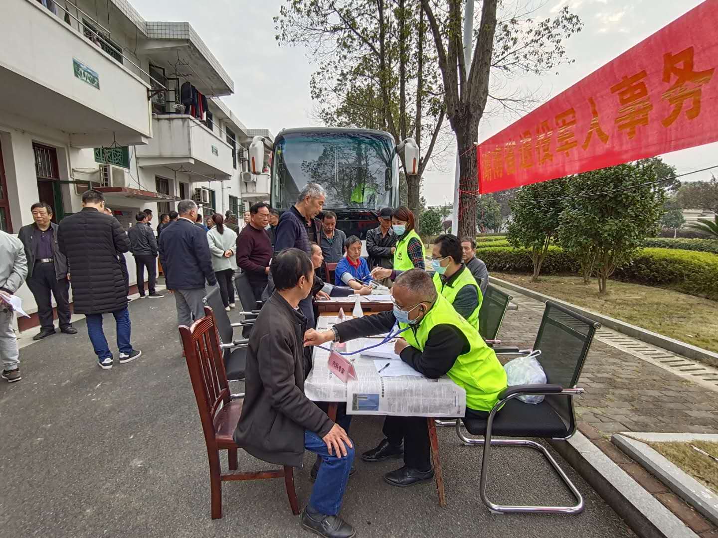 活动现场,人头攒动,热闹非凡。近百名符合条件的退役军人按签到顺序前往临时设置的问诊台就诊。退役军人们经过问诊台初步诊断后,继续前往巡诊车上进行血糖、血常规、心电图、B超等项目检查。医护专家们将根据每一位优抚对象不同的身体情况,为他们免费开方抓药。