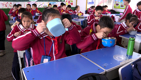 中午12点,同学们结束了上午的学习,纷纷带好餐具,按小组顺序在班级门口排队打餐。他们一个接一个,打好餐后回到座位上大口大口地吃起来。不一会儿,一些同学就已经吃完了碗里的饭菜,有些吃得较慢的也是不慌不忙,直至把饭菜全部吃光,没有发现浪费粮食的情况。