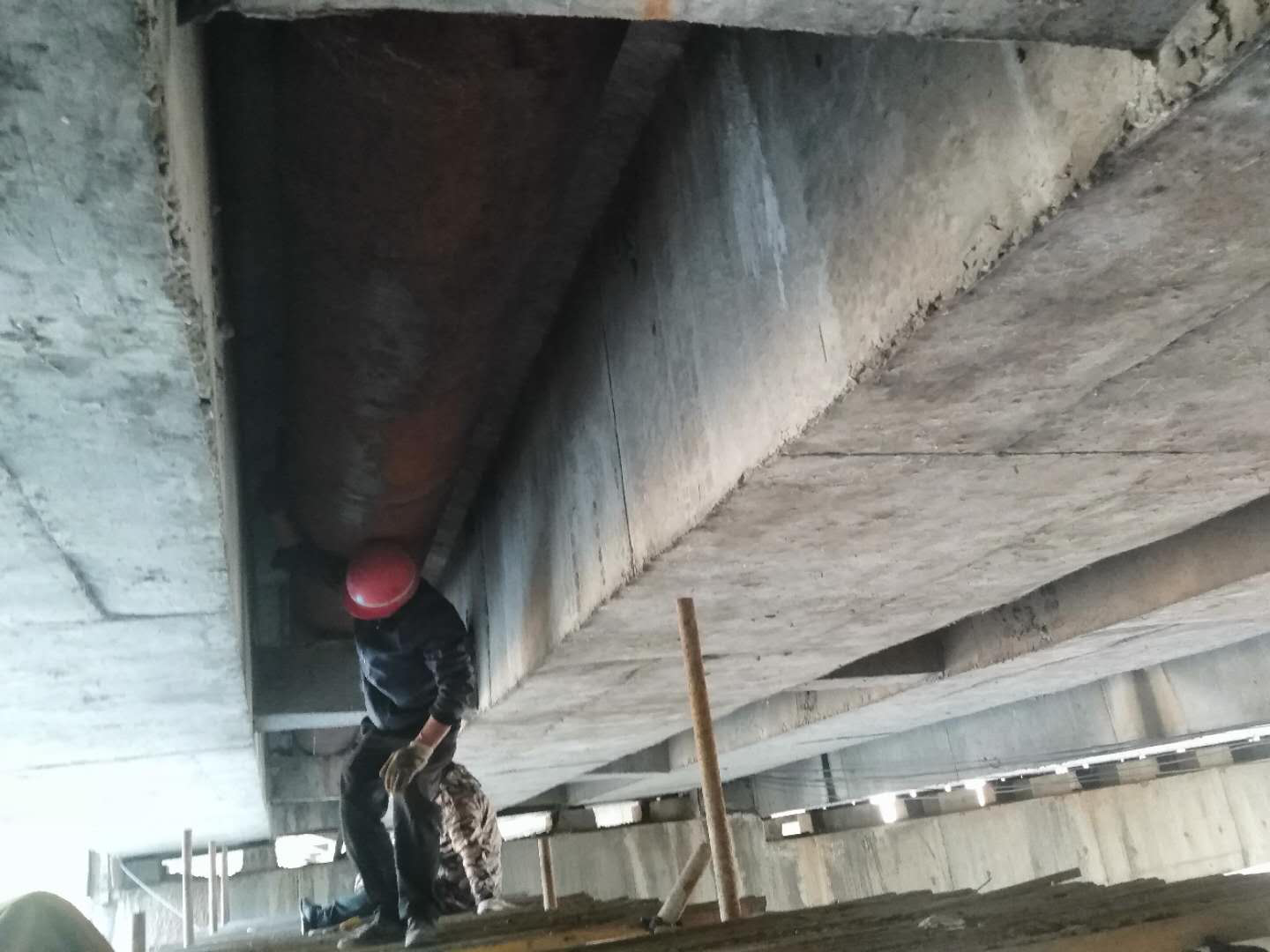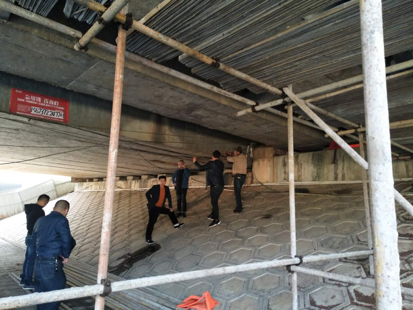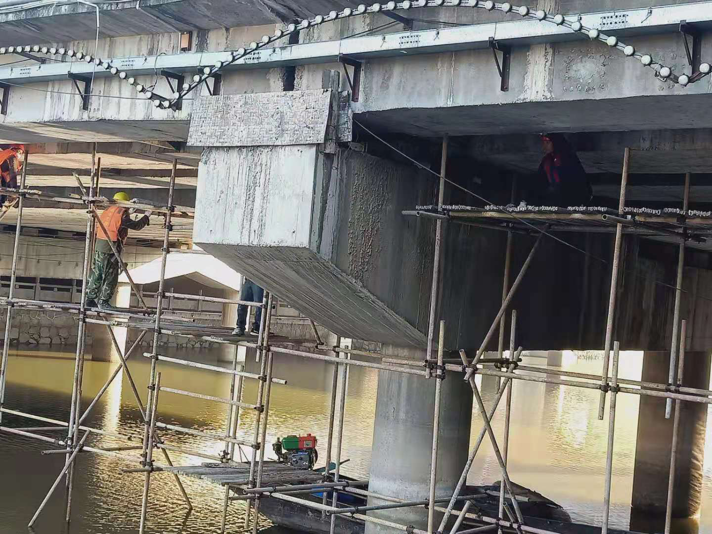 太阳桥桥台背处路面横向开裂,加设伸缩缝,桥下管线凌乱,建筑垃圾,模板清理不彻底。桥头处路肩沉降开裂、外倾。泄水孔堵塞且设落水管,随桥自来水管及固定构建锈蚀严重,有安全隐患。水中桥墩立柱长期受冲刷,表层破坏露骨严重,采用玻纤套筒结合注浆等方法对墩柱进行处理,保护。