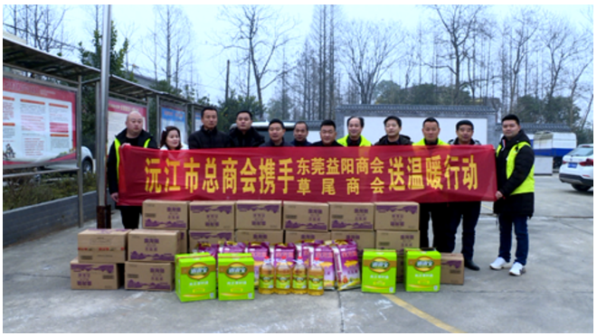 1月5日上午,沅江市总商会联合东莞益阳商会、草尾商会来到草尾镇开展送温暖活动,为草尾镇的群众送去大米与食用油。沅江市委常委、市委办主任李向前,市政协副主席陈群力参加活动。