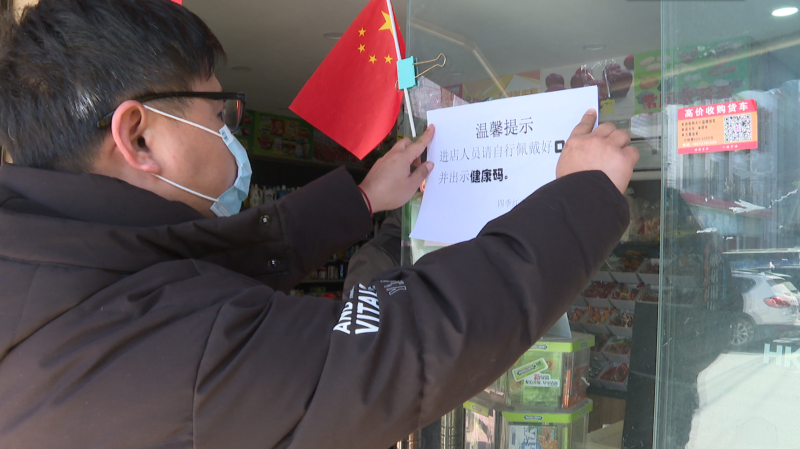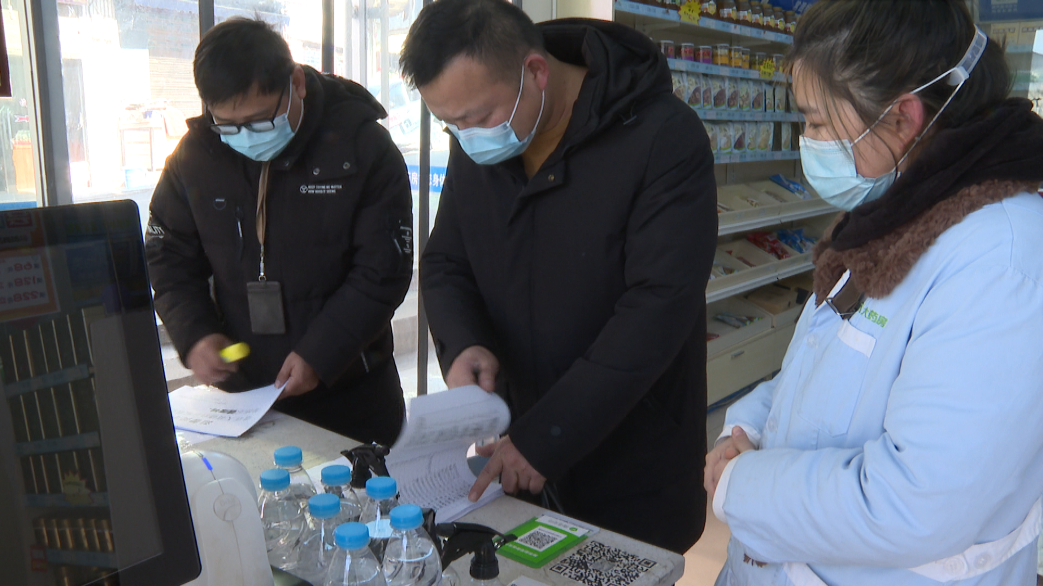 在四季红镇一药店内,来自市场监督管理所的工作人员正对店内日常防疫措施进行监督检查,除了认真查看登记台账、消毒水以及体温枪等常备物品外,工作人员还会向他们宣传好相关政策和要求,发放口罩,张贴疫情防控宣传标语。
