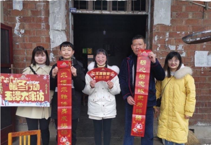 “老师,你们来了,快请进。”冰冰(化名)妈妈从路口探出身来,沅江市玉潭学校团委书记周丽丽、班主任陈莎等人一同到了冰冰家,手上拿着孩子的学期报告单、荣誉证书、奖品以及精美的对联门贴……