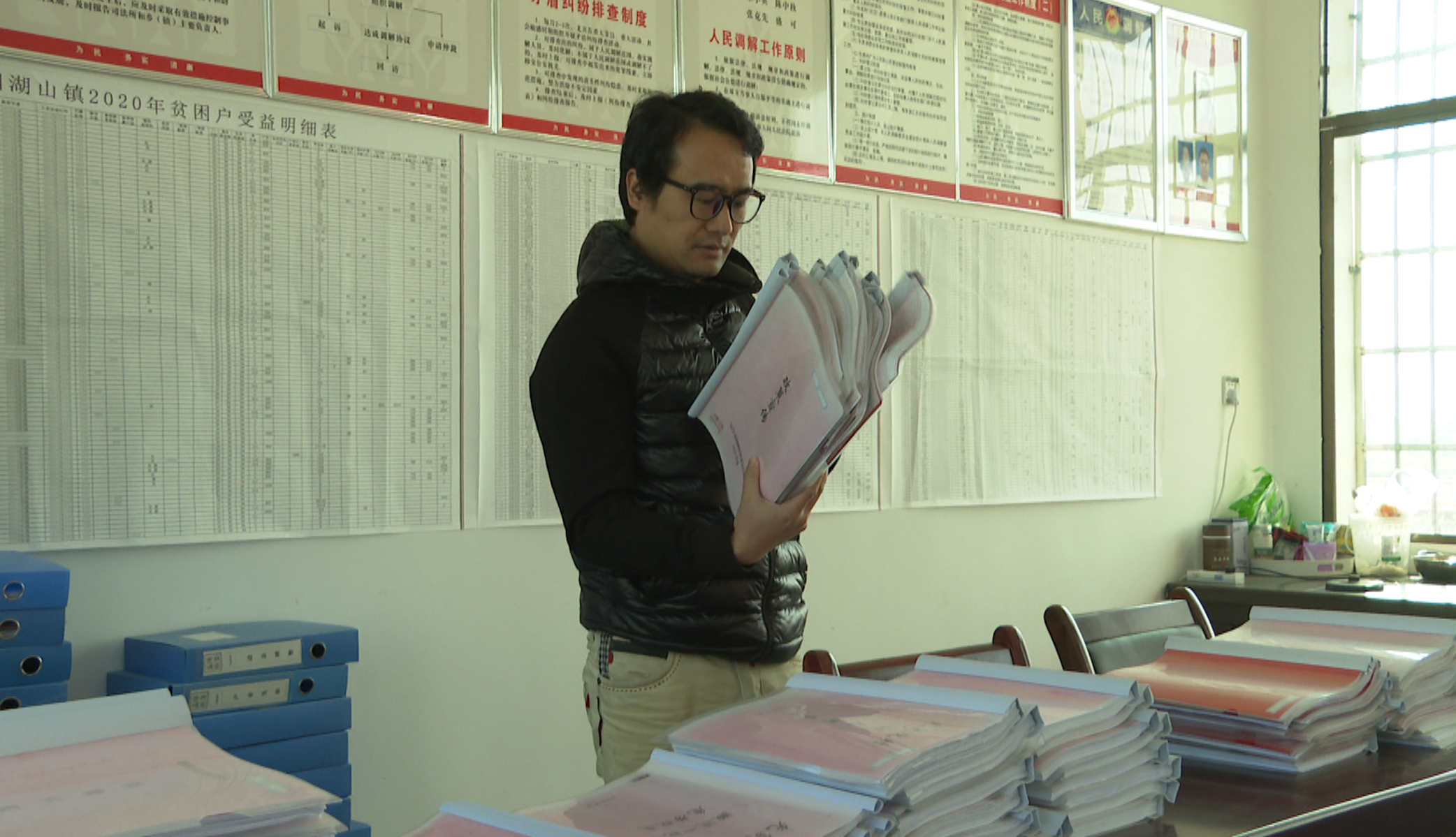 临近年关,泗湖山镇光复垸村驻村扶贫工作队正忙着整理贫困户资料,一排排整齐的扶贫资料记录着工作队在光复垸村扶贫的点点滴滴。每一个贫困户的家庭情况,都储存在了驻村工作队员的心中。