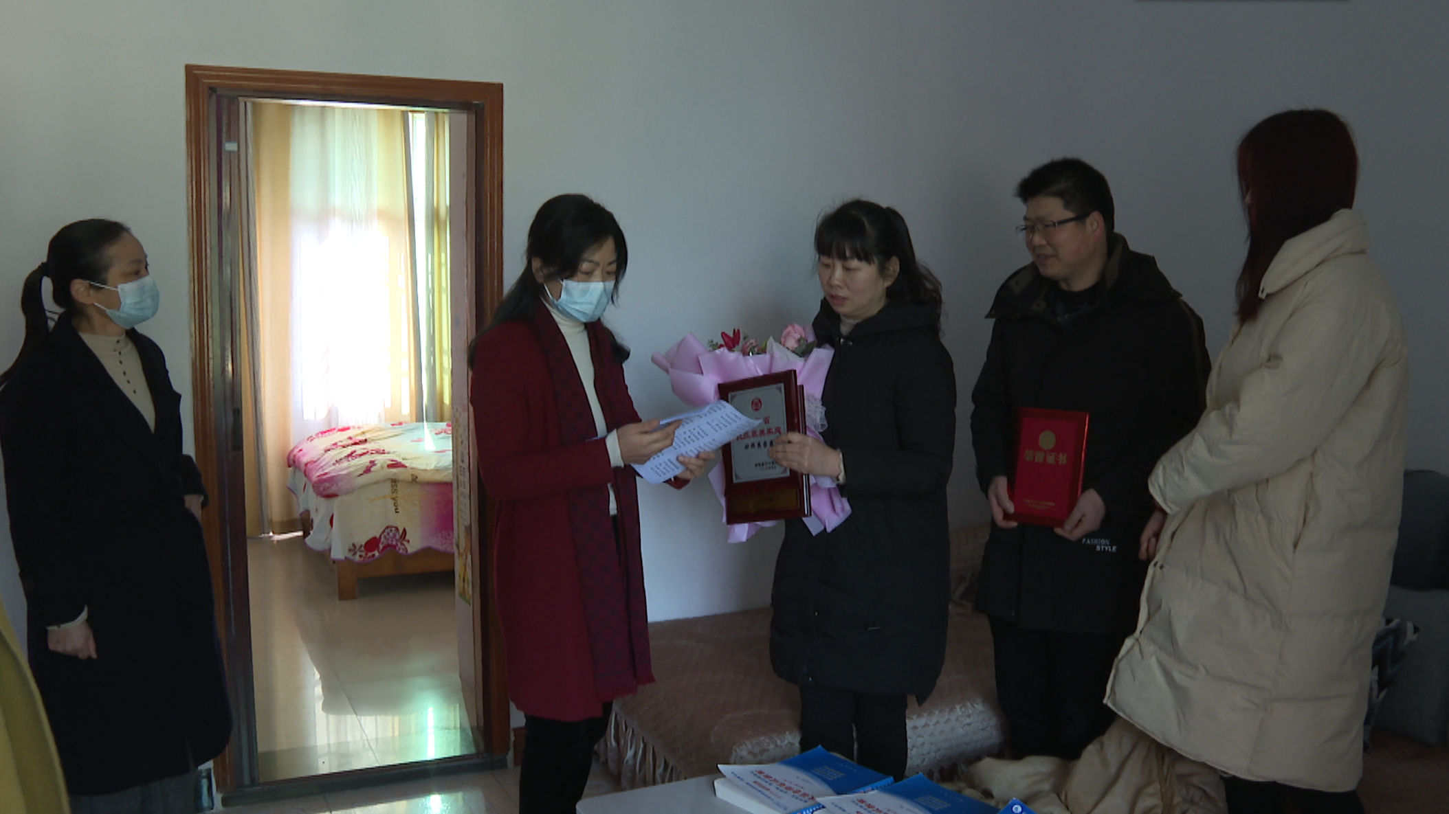 在黄茅洲镇二人民医院,市妇联与黄茅洲镇工作人员一同,带着鲜花和荣誉证书来到钟群英家,详细了解他们的生活情况,对他们的家庭予以肯定和表扬,鼓励他们继续传承家庭美德和良好家风,与家人相亲相爱、相互扶持,以小家带大家,共创美满幸福生活,共建和谐家庭。