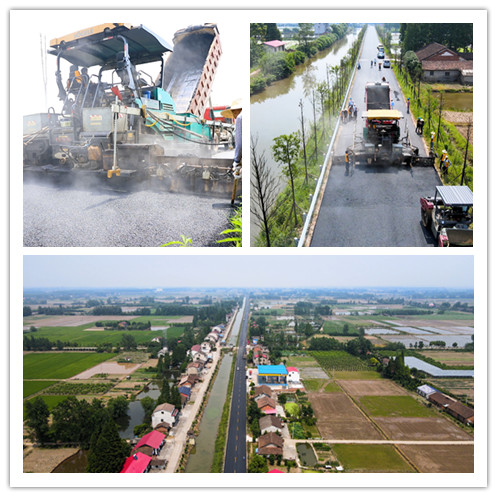 前方修路,后方的工人则冒着高温,开始道路标志线的划分和安全防护栏的安装。新植的行道树笔直站立,树叶在微风中轻轻摇曳,人们撑伞在路上行走,感受着绵延不尽的乡村情怀。