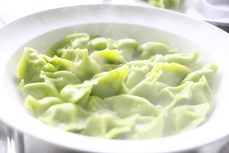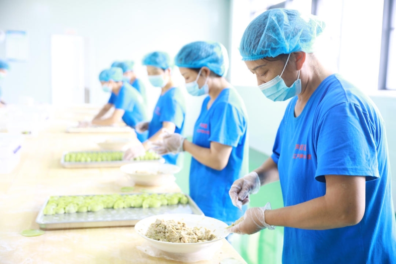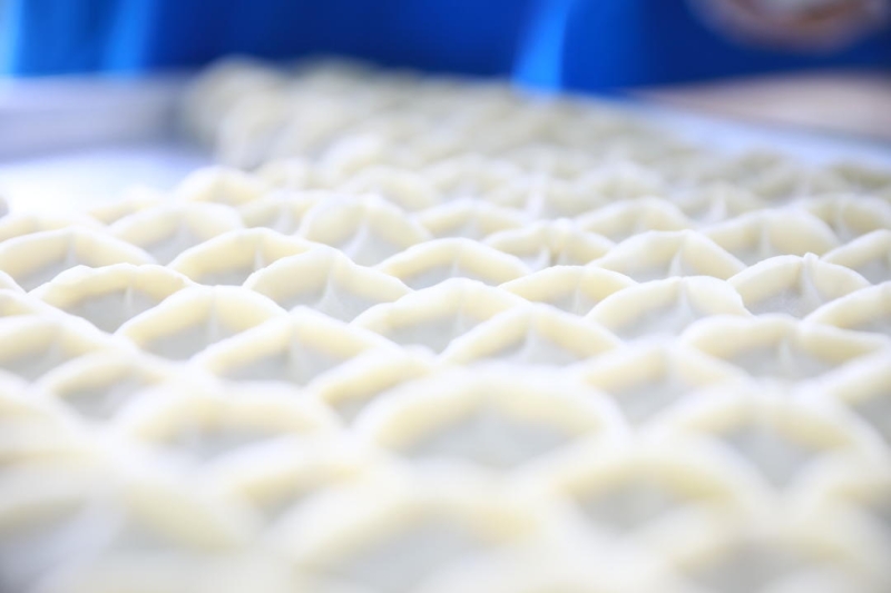 在湖南湘龙绿色食品有限公司的生产车间内,工人们正在制作饺子。水饺馅料采用沅江特产芦笋、芦菇为主要食材。饺子以传统工艺制作而成,工人们分工合作,手工擀皮、手工包制。因为面皮中加入了芦笋汁,包出来的饺子呈翡翠绿色,葱翠欲滴,看起来与众不同。绿色的芦笋水饺、白色的芦菇水饺,风味各异;煮出来的饺子,皮薄馅满、晶莹剔透,色、香、味俱全。