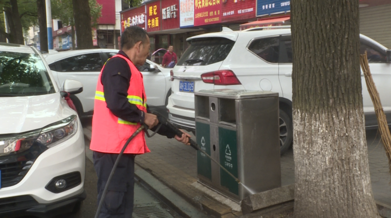 在金融路,环卫工人正在用高压水枪对垃圾桶以及周遭地面进行清洗,在强有力的水流之下,垃圾桶焕然一新,地面也变得干干净净。