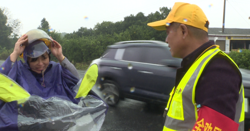 冬雨绵绵,在新湾镇桥北村路口,寒风中,交通劝导员正冒雨进行安全劝导。遇到不佩戴安全头盔的行为,劝导员立即上前制止,并要求驾驶员佩戴好安全头盔后才能上路。遇到出行没有戴头盔的村民,劝导员现场进行安全教学,并要求其尽快购买头盔。